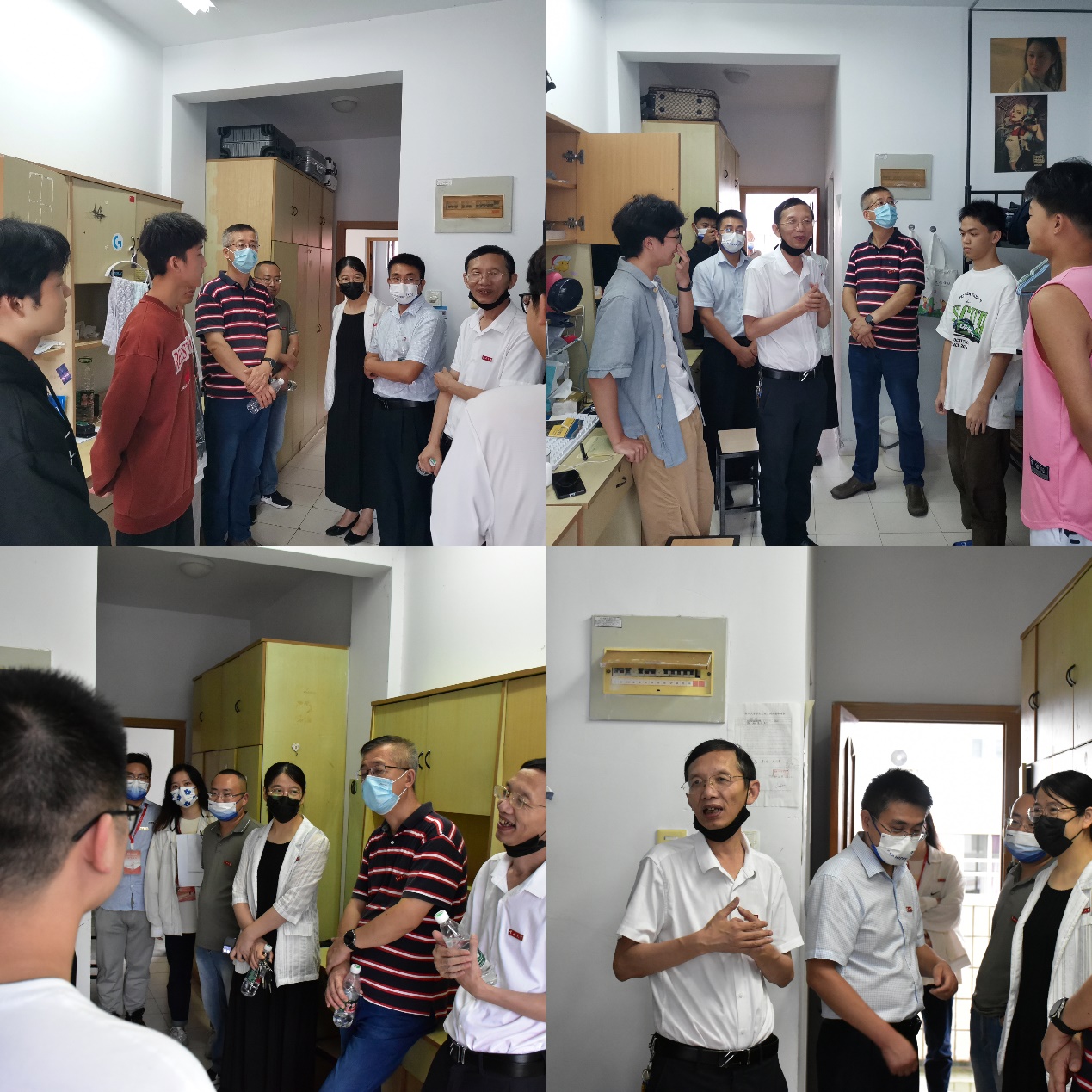 15日下午14:00,学院领导一行人首先来到了二号楼男生宿舍,在查看了基础设施、环境卫生等情况后,开始进入学生宿舍。他们细致耐心、亲切和蔼地逐一走访,将学院的问候和对新学期的期许带给每一位新生。敲开一间间宿舍门,门后是一张张惊喜而略带紧张的青涩脸颊。“同学你来自哪里呀?”“对学校第一印象怎么样?”“在学校有没有碰到什么困难或不方便的地方?”在走访中,学院领导们与新生们亲切交谈,全面细致地了解新生的基本情况,询问了大家对于当地气候条件和生活起居等方面的适应程度;对于不同省份新生的家乡特色、特产进行了热切谈论,并对来自五湖四海的室友之间的相互磨合提出了宝贵建议;他们与新生促膝而谈,鼓励大家畅所欲言,叮嘱新生注意个人防护,遵守学校疫情防控规定,谨防诈骗;在了解到一个宿舍全部同学都励志考研时,他们对宿舍的学习氛围和同学们的学术追求给予了充分肯定,并勉励大家在追求学术的同时也要注意放松身心,强身健体。