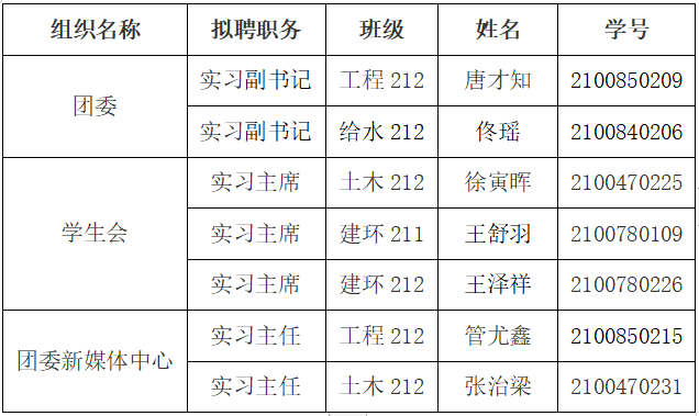 经学生本人申请,并通过竞选、答辩及民主投票等环节综合测评,院团委审核,现将2023-2024学年学院学生组织主席团成员拟聘人选公示如下(考察期三个月),实习期满考察合格后转正: