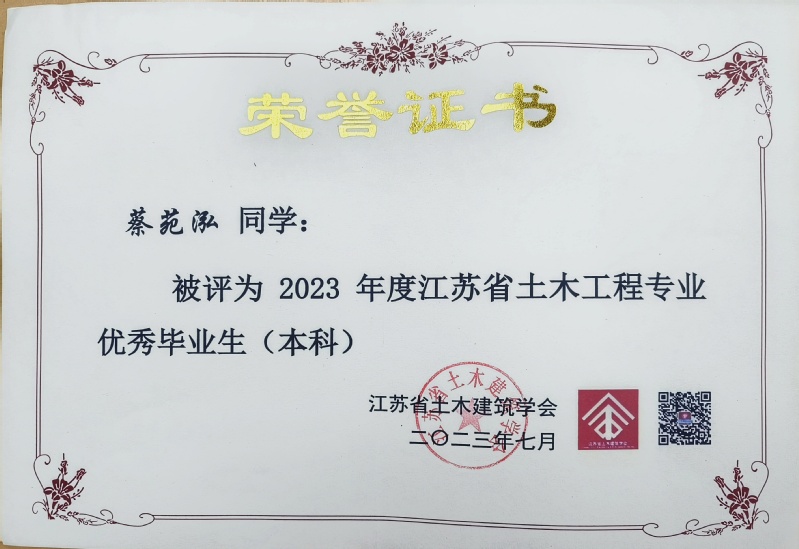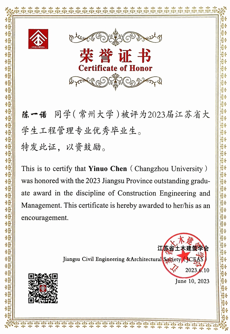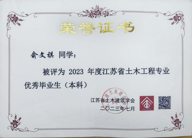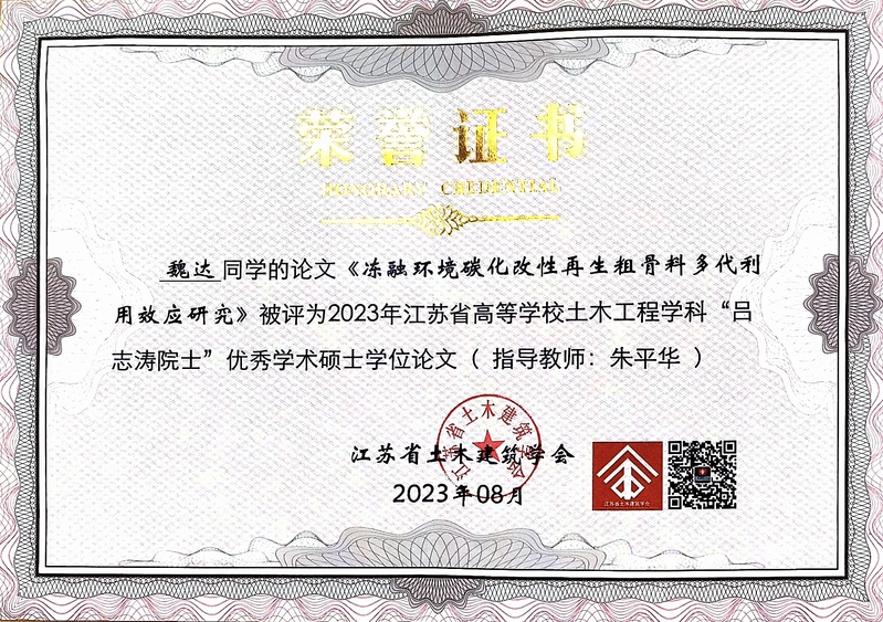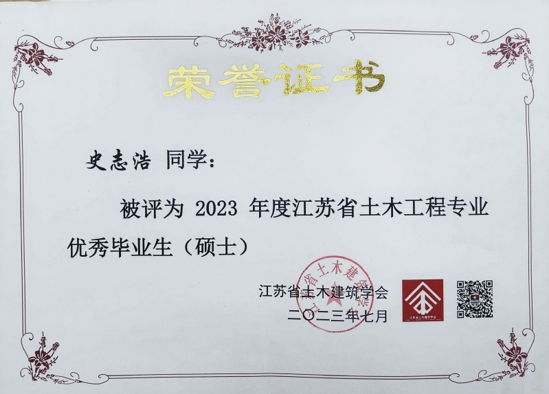 近日,从江苏省土木建筑学会传来喜讯,ACG盒子 2023届本科毕业生土木工程专业俞文祺、蔡苑泓获评“2023年度江苏省土木工程专业优秀毕业生(本科)”,工程管理专业陈一诺获评“2023届江苏省大学生工程管理专业优秀毕业生”,硕士毕业生史志浩获评“2023年度江苏省土木工程专业优秀毕业生(硕士)”。硕士毕业生魏达的毕业论文《冻融环境碳化改性再生粗骨料多代利用效应研究》(指导教师:朱平华)被评为“2023年江苏省高等学校土木工程学科‘吕志涛院士’优秀学术硕士学位论文”。