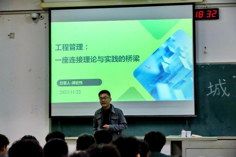 本次导学主题为“工程管理—一座连接理论与实践的桥梁”。讲座开始,傅老师引出项目的概念,积极与学生互动,深入浅出地讲解了工程管理的定义、内容与实践案例。其中,傅老师通过列举“鲁布革水电站”的案例,向同学们介绍了我国工程管理的发展起源及重要性。随后,傅老师为同学们详细分析了专业关键技能与素养、工职业发展与机会和未来挑战与发展趋势。最后现场解答了学生的问题,提出合理的建议。