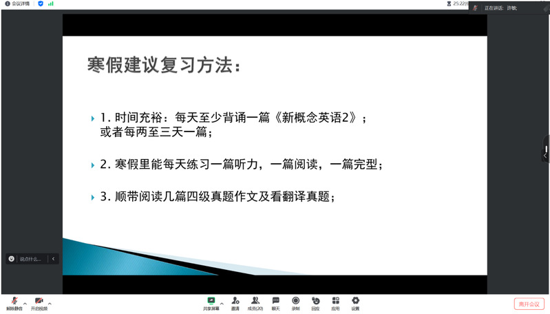 许敏指出,大学生英语四级证书是当下就业和考研的基础证书,建议利用充裕的寒假时间,制定个性化的学习计划。随后,许敏老师分享了每日背诵、阅读技巧、单词积累等方法,让同学们通过大量的阅读和背诵,增强语感,达到举一反三的水平。同时介绍了学院春学期四级帮扶计划,更有针对性地提高同学们的复习效率。