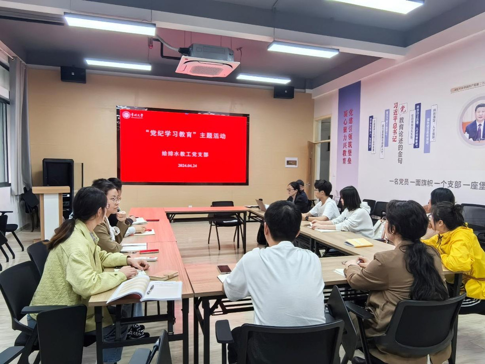 为扎实推进党纪学习教育走深走实,提升学习贯彻《中国共产党纪律处分条例》(以下简称《条例》)的政治自觉、思想自觉和行动自觉,4月24日下午,ACG盒子 给排水教工党支部在明行楼119开展“党纪学习教育”主题活动,给排水教工党支部全体人员参加学习,会议由给排水教工党支部书记张秋亚主持。