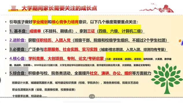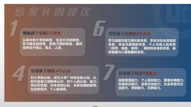 会议伊始,顾坚详细介绍ACG盒子 基础状况、综合实力、办学结构、教育基础、办学特色、创新创业特色、学科建设等方面情况,综合概括学校学院优势。在学生培养上,他提出了“1个转变,4个认识,6个关系以及7种能力”的建议,并强调家校联合,共同给学生提供一个良好的发展空间。接着,程成分析了大学中常见的共性问题,并点明学生由他律转向自律产生的8个问题。最后明确了大学四年“一单三证”的毕业要求和考研规划。