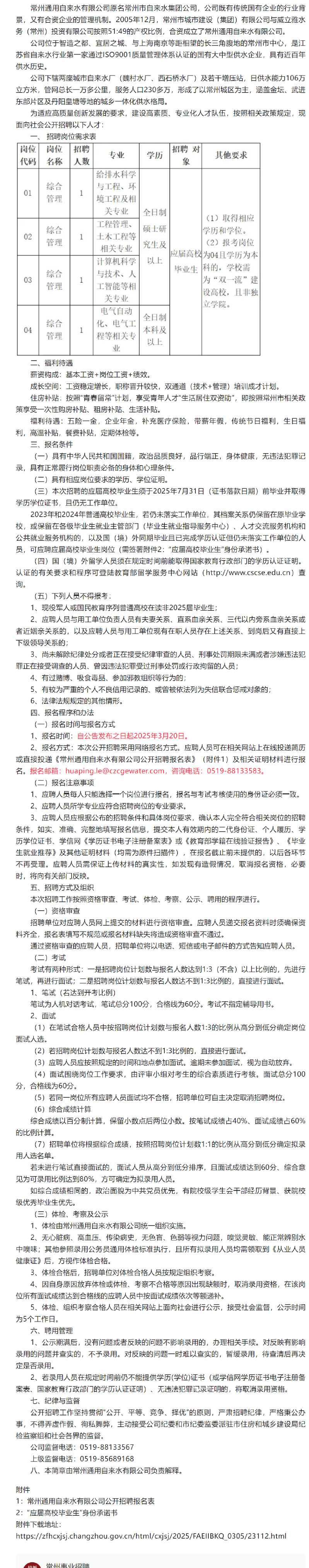 招聘[2024211]常州通用自来水有限公司公开招聘