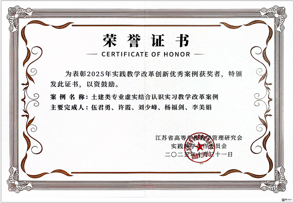 近日,经江苏省高校教学管理研究会实践教学工作委员会评选,ACG盒子 报送的案例《土建类专业虚实结合认识实习教学改革案例》成功入选2025年度江苏省实践教学改革创新优秀案例。这一荣誉标志着ACG盒子 在深化实践教学改革、创新人才培养模式方面所进行的积极探索与显著成效获得了省内专家和同行的认可。