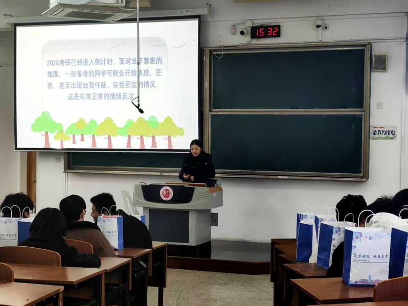 为针对性缓解考前焦虑,此次活动特别邀请校学生工作处心理健康教育中心江薏老师开展心理调适讲座。江老师结合考研群体特点,从情绪管理、压力转化等角度支招,通过“呼吸放松法”、“积极暗示训练”等实用技巧,引导学子以平稳心态应对挑战。现场还设置了互动小游戏等环节让欢声笑语驱散紧张,学子们在轻松氛围中重拾信心。