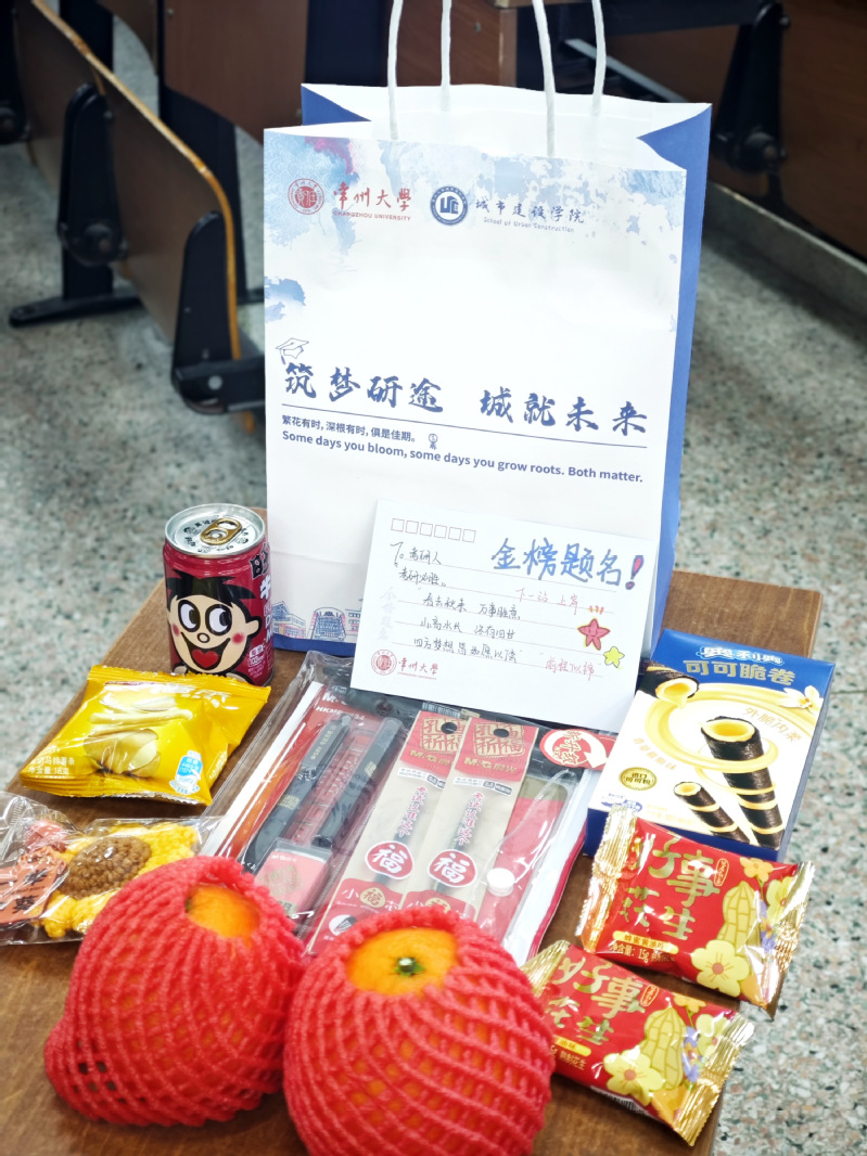 活动伊始,一段精心制作的暖心视频拉开序幕。视频中,汇集了考研学子伏案苦读的视频,送上了师长寄语和学弟学妹祝福,共同表达对学子的殷切期盼。随后,学院领导与辅导员为考研学子送上满载祝福的慰问品:一张张写有学弟学妹们祝福的明信片,一份份文具套装寄望妙笔生花,“旺仔牛奶”寓意“运气旺旺”,“一举夺魁”钥匙扣更以巧思传递必胜信心,承载着温暖与力量。每一份礼物都藏着“一战成硕”的深情期许。